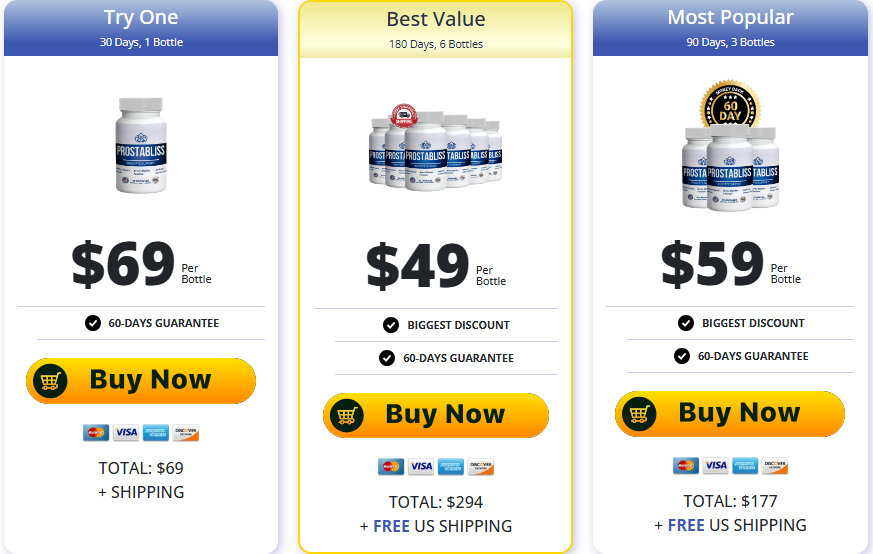 Currently, Prostabliss is backed by a 60-day money-back guarantee. Free shipping on multi-package deals and additional bonuses are also available. If you’re looking for a natural and effective solution to support your prostate health, enhance male vitality, and improve overall well-being, Prostabliss is the right choice for you.